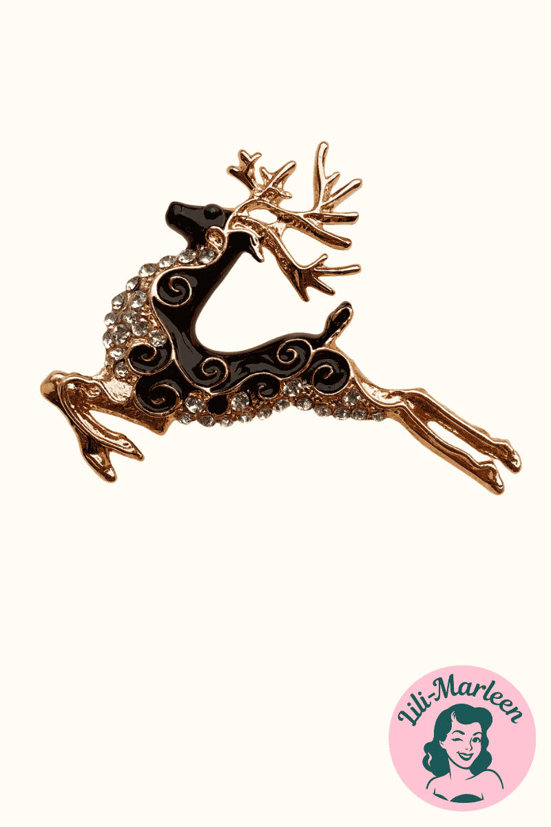 Broche – Midnight Reindeer – Sort og guld rensdyrbroche med funklende sten: Lad elegance og mystik mødes i Midnight Reindeer – en raffineret julebroche i sort og guld med glitrende klare sten. Den smukke kombination af dyb sort emalje og gyldne detaljer giver et luksuriøst vintageudtryk, der skiller sig ud fra de klassiske julefarver. Perfekt til at pifte dit outfit op med et strejf af glamour – uanset om du bærer kjole, blazer eller frakke.