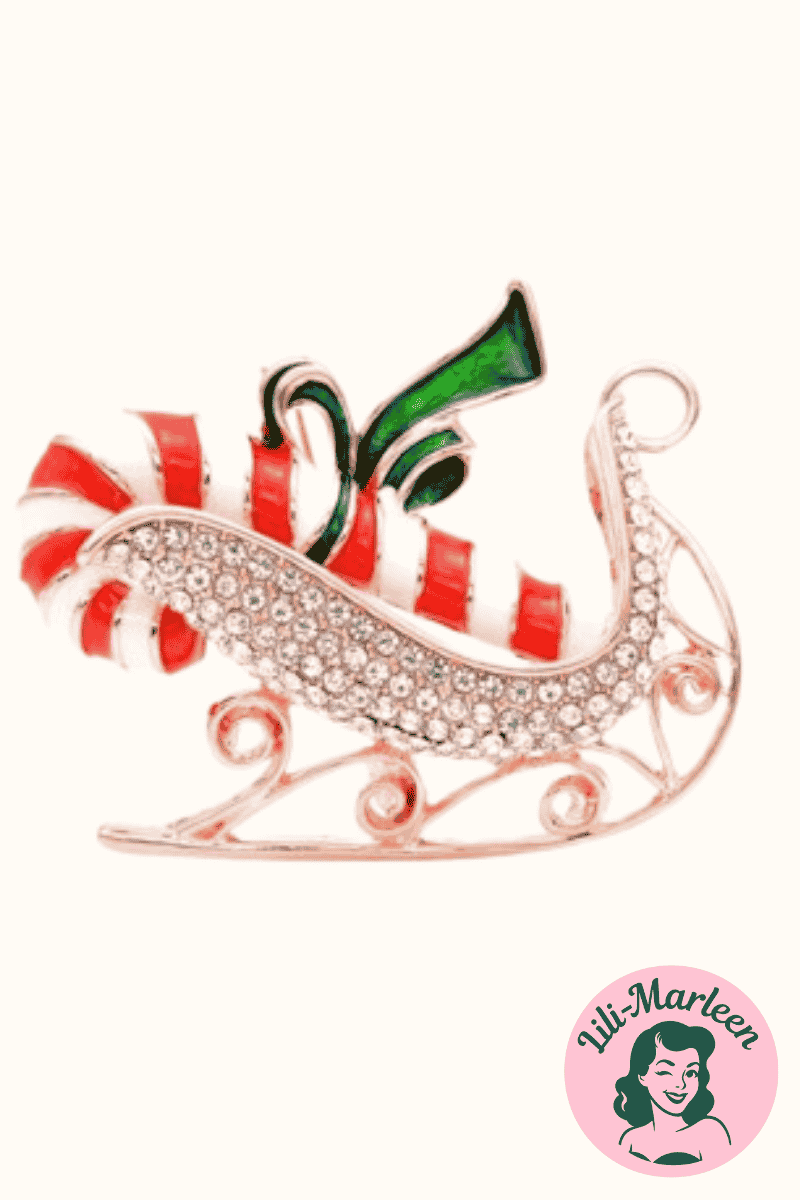 Bring magien tilbage i julen med Candy Sleigh – en charmerende julebroche formet som en gylden kane fyldt med en rød- og hvidstribet slikstok og pyntet med glitrende sten. Den funklende finish og de klassiske julefarver giver et elegant, nostalgisk udtryk, der passer perfekt til dine vintagekjoler, frakker eller julefester.