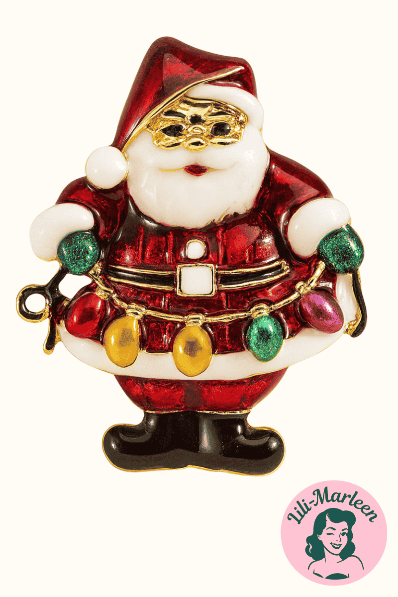 Lad julemagien funkle med Santa Lights – en livlig og detaljeret broche, hvor julemanden står med en guirlande af farverige julelys. De glinsende emaljefarver og de gyldne detaljer gør brochen både festlig og charmerende, perfekt til kjoler, frakker eller julefrokostens outfit. Et lille stykke retroglæde, der spreder smil, uanset hvor du bærer den.