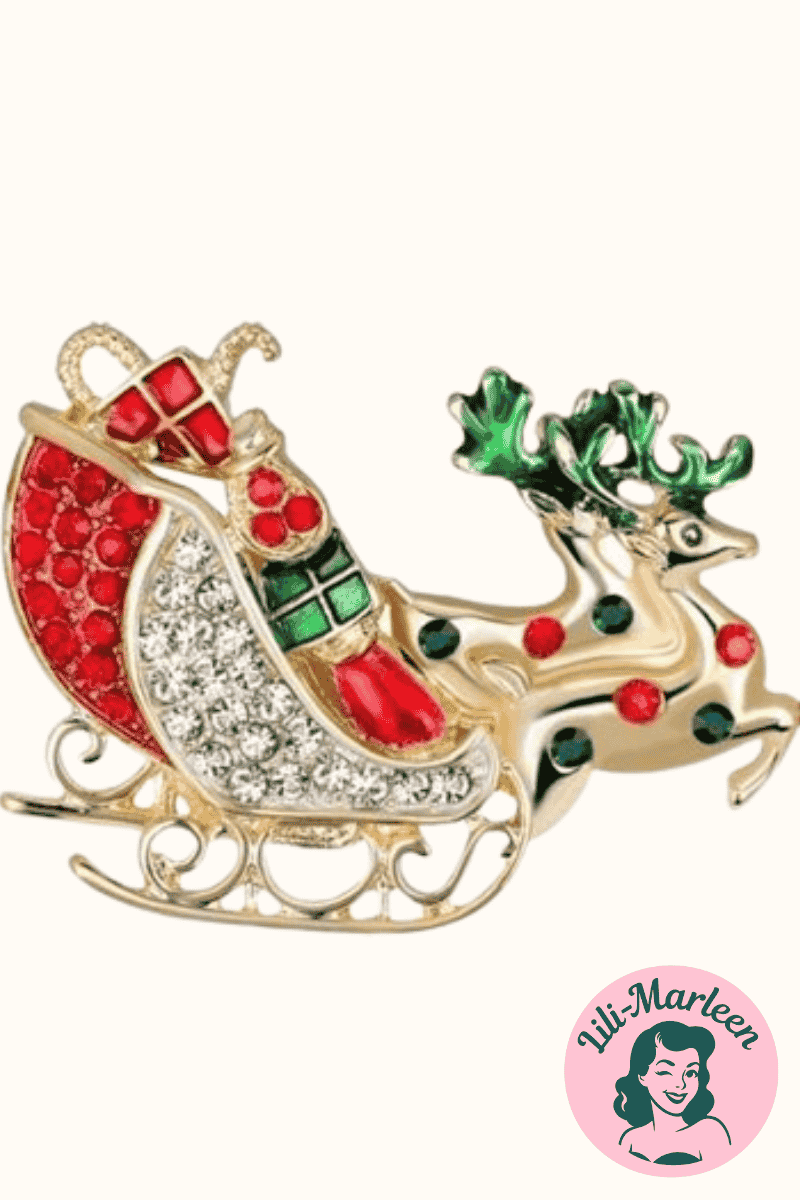 Fuldend dit julelook med Reindeer Express – en overdådig og glitrende broche, der fanger hele julens magi i ét smykke. Den smukke gyldne kane er fyldt med røde og grønne gaver, trukket af et elegant rensdyr med funklende detaljer. En sand vintagefavorit, der spreder juleglæde, uanset hvor du bærer den – på kjolen, frakken eller din yndlingscardigan.