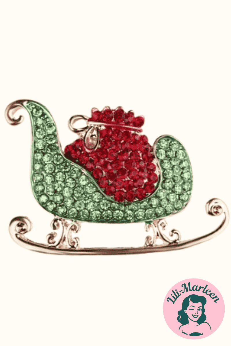 Skab et magisk julelook med Santa’s Sleigh – en elegant broche formet som julemandens kane, fyldt med gaver og pyntet med glitrende sten i røde og grønne nuancer. Kombinationen af vintageguld og juveltoner giver brochen et luksuriøst udtryk, der oser af jul, tradition og glamour. Perfekt som blikfang på kjolen, frakken eller et tørklæde i den kolde decembertid.