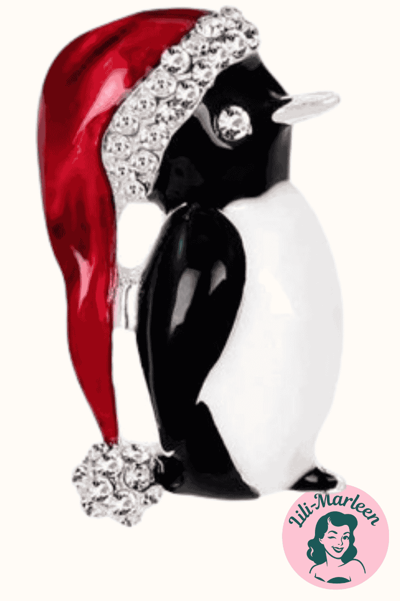 Denne søde Julepingvin er den perfekte ledsager til vinterens hyggelige stunder. Med sin røde nissehue prydet med glitrende sten og det klassiske sort-hvide look bringer den både smil og stil til ethvert outfit.