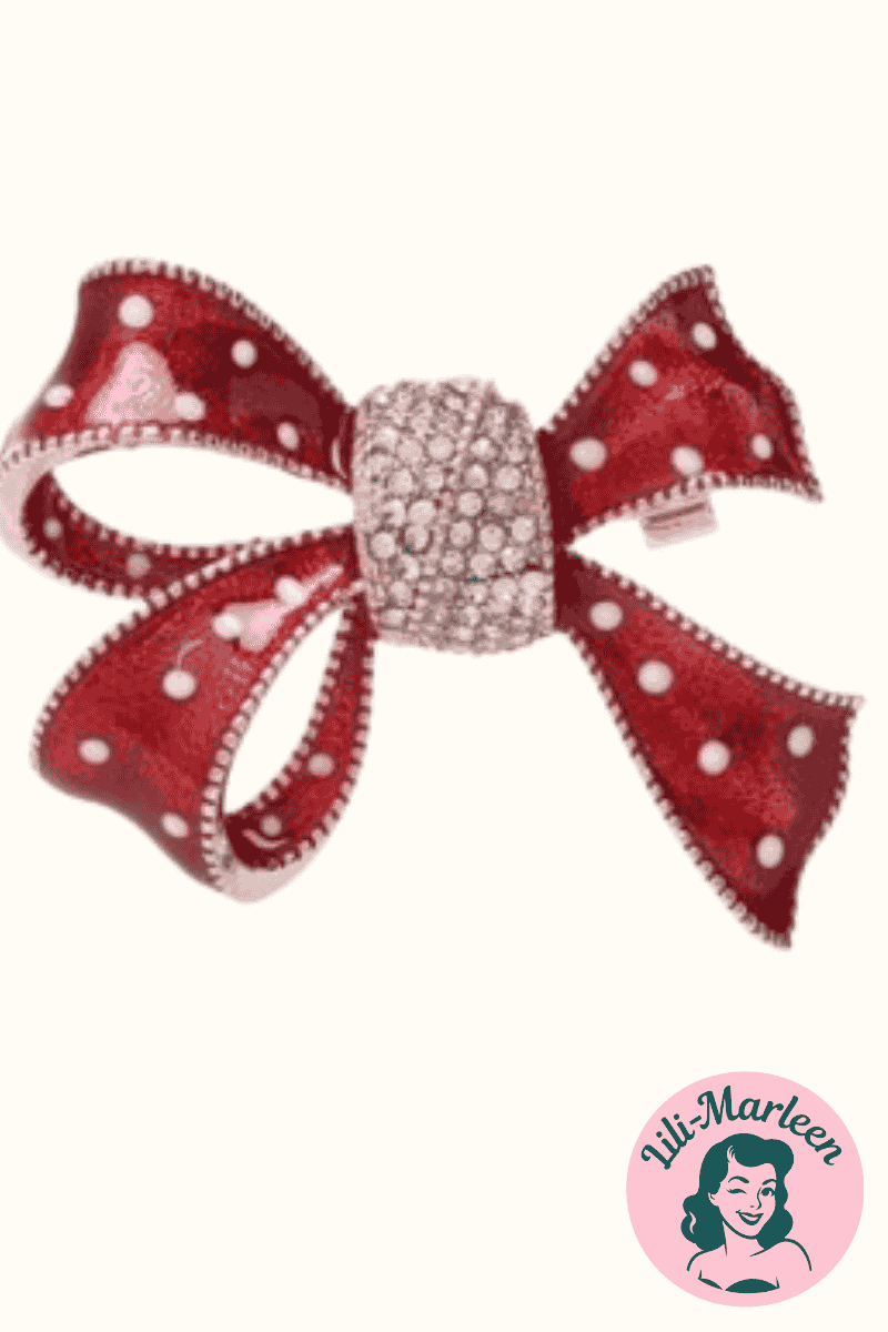 Broche – Red Bow Sparkle – Rød sløjfe med hvide prikker og funklende sten: Bring vintageglamour og festlig charme til dit outfit med Red Bow Sparkle! Denne elegante broche i dyb rød emalje med hvide prikker og en midte af glitrende klare sten er både klassisk og iøjnefaldende. Den fanger præcis den slags feminin energi og retrostemning, som gør ethvert look lidt mere særligt.