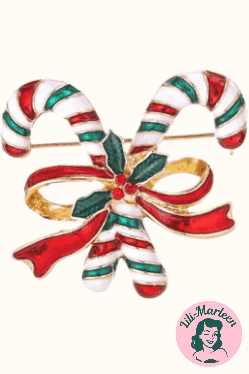 Broche – Candy Cane Delight – Slikstokke med rød sløjfe og juleglimt