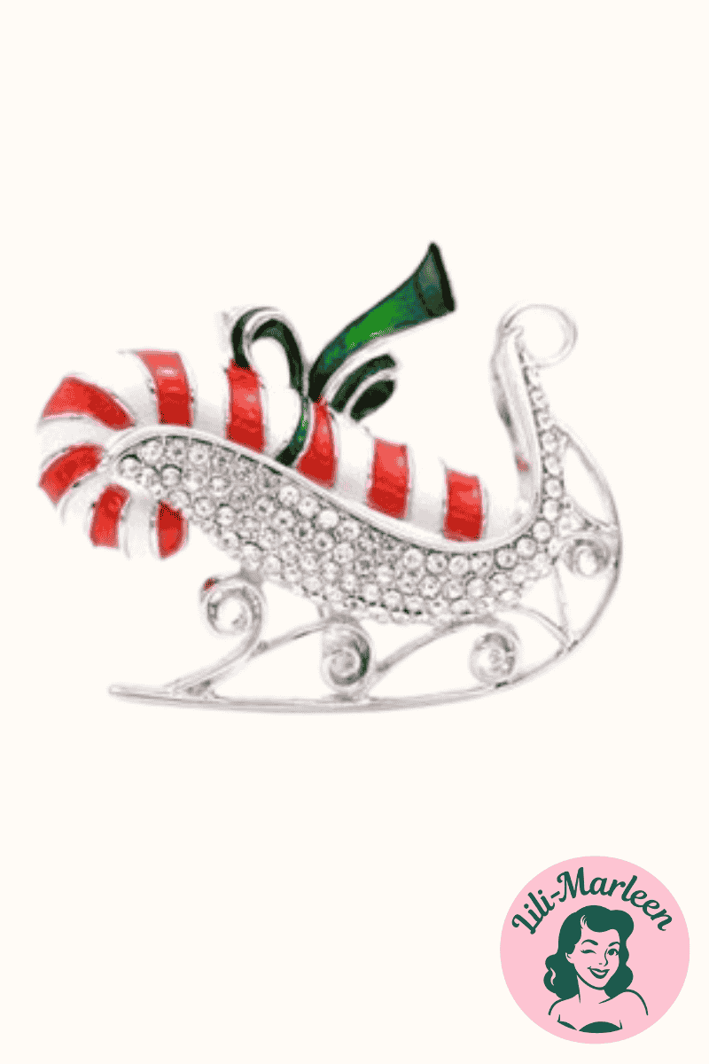 Tilføj et strejf af eventyrlig julestemning med Silver Sleigh – en elegant broche i sølvlook dekoreret med funklende sten og klassisk rødhvid slikstok. De små grønne blade giver designet et frisk pust, mens den svungne form gør den både feminin og iøjnefaldende.