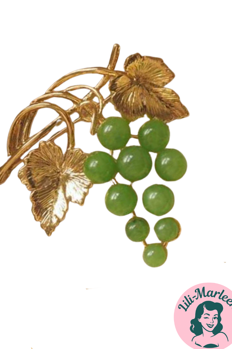 Denne smukke broche er inspireret af naturens elegance og har et iøjnefaldende vindrueklase-design. De lysegrønne perler efterligner saftige druer, mens de guldtonede blade, dekoreret med funklende klare sten, tilføjer et luksuriøst og stilfuldt udtryk.