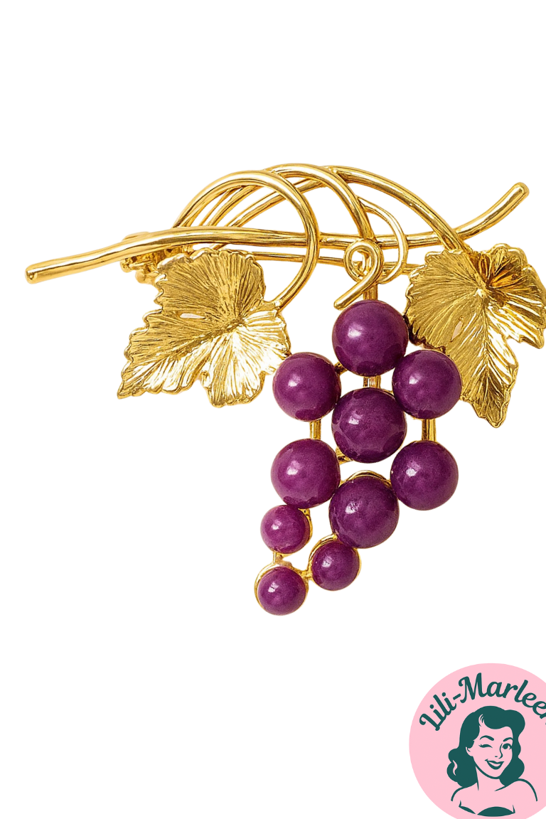 Denne smukke broche er inspireret af naturens elegance og har et iøjnefaldende vindrueklase-design. De lilla halvgennemsigtige perler efterligner saftige druer, mens de guldtonede blade, dekoreret med funklende klare sten, tilføjer et luksuriøst og stilfuldt udtryk.