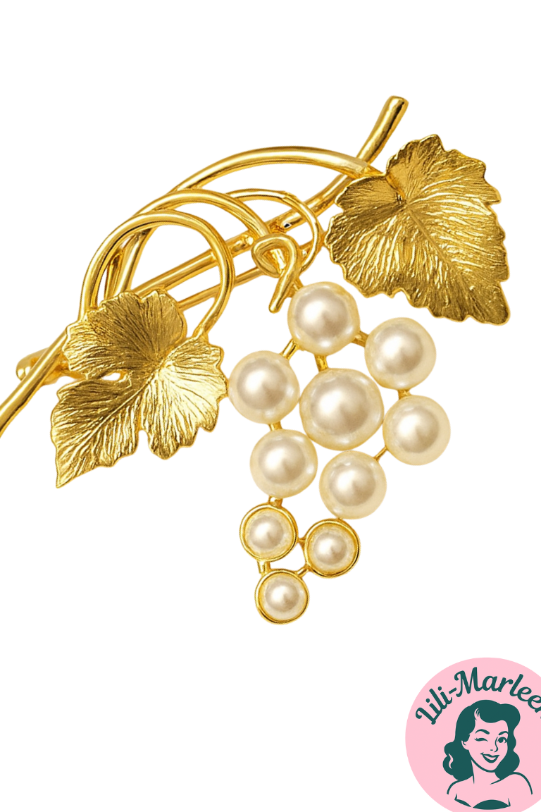 Denne smukke broche er inspireret af naturens elegance og har et iøjnefaldende vindrueklase-design. De smukke perlermors perler efterligner saftige druer, mens de guldtonede blade, dekoreret med funklende klare sten, tilføjer et luksuriøst og stilfuldt udtryk.