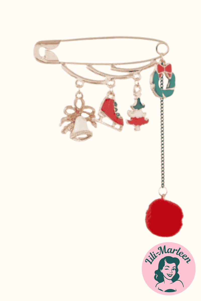 Tilføj et strejf af humor og elegance til din julegarderobe med Jingle Charm Pin – en unik broche formet som en gylden sikkerhedsnål med små, charmerende vedhæng: klokke, julesok, juletræ og krans. Den røde pompon i enden giver et legende og varmt udtryk, der oser af vintagejul og personlig stil.