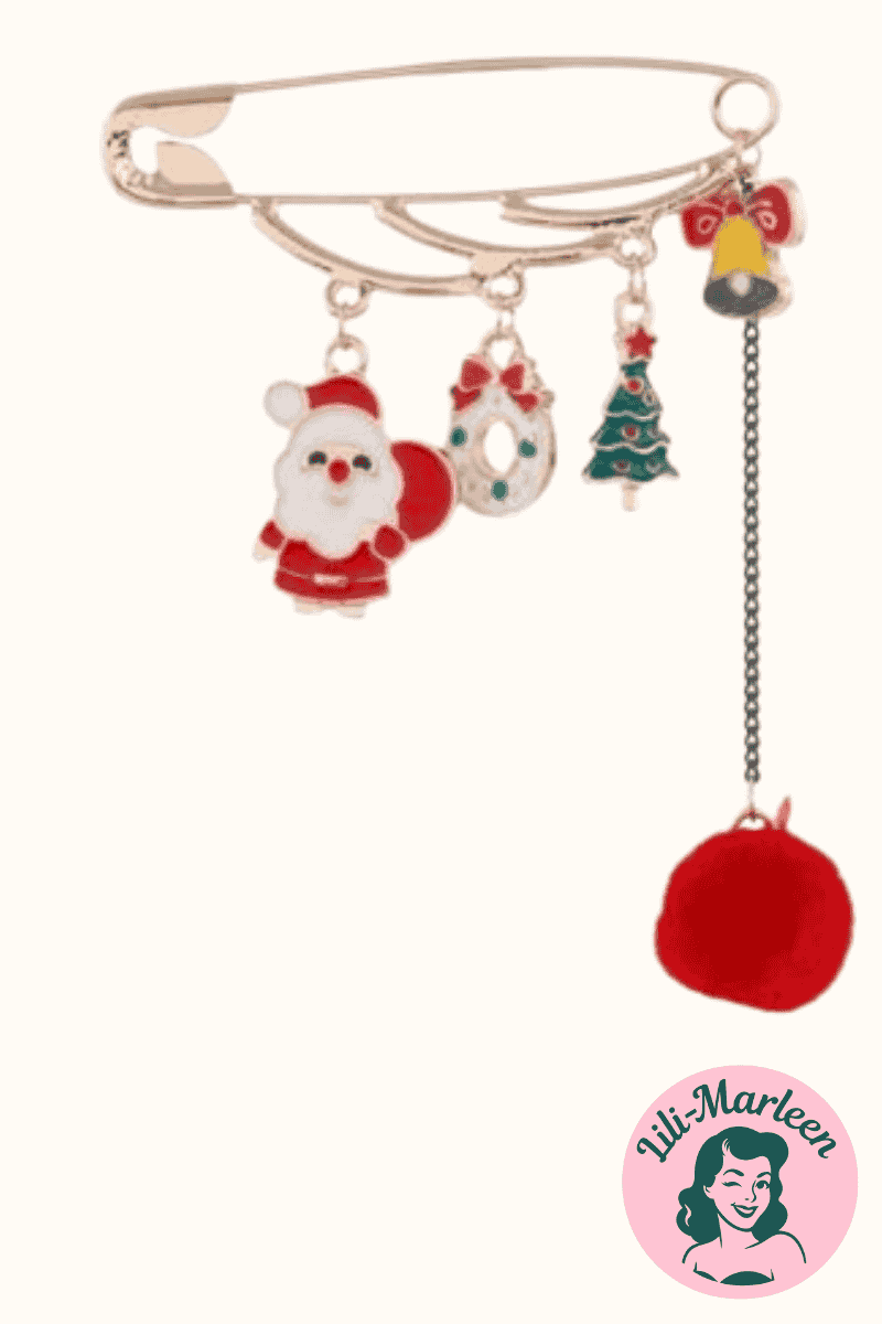 Bring juleglæden helt tæt på med Santa’s Charm Pin – en festlig og sjov broche formet som en gylden sikkerhedsnål med små, glade vedhæng: julemand, krans, juletræ og klokke. Den røde pompon i enden giver et legende og varmt udtryk, som straks spreder smil og julestemning.