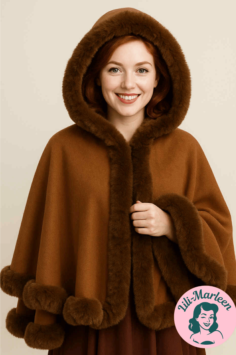 Cape med hætte – Miss Woodsy, varm brun med faux fur