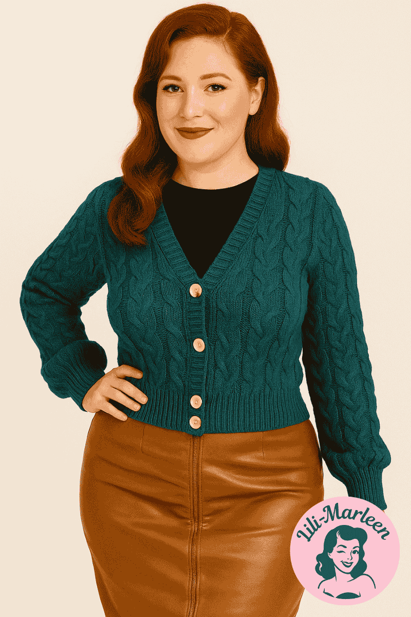 Carla Cardigan - Teal - Retro klassisk og feminin elegance med moderne komfort: Smuk og feminin Carla Cardigan i en tidløs og klassisk teal er et must-have i enhver garderobe. Den bløde strik og fine detaljer gør den til den perfekte cardigan til at pifte ethvert outfit op. Kort og alsidig, så du kan style den med en kjole, en nederdel eller dine vintagebukser – eller bruge den som en lun strikbluse på kølige dage.