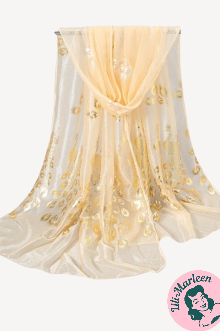 #ChiffonSjal #CremeSjal #GuldDetaljer #PåfugleDesign #LiliMarleenFashion #GlimmerGlamour #ElegantAccessories #TidLøsMode