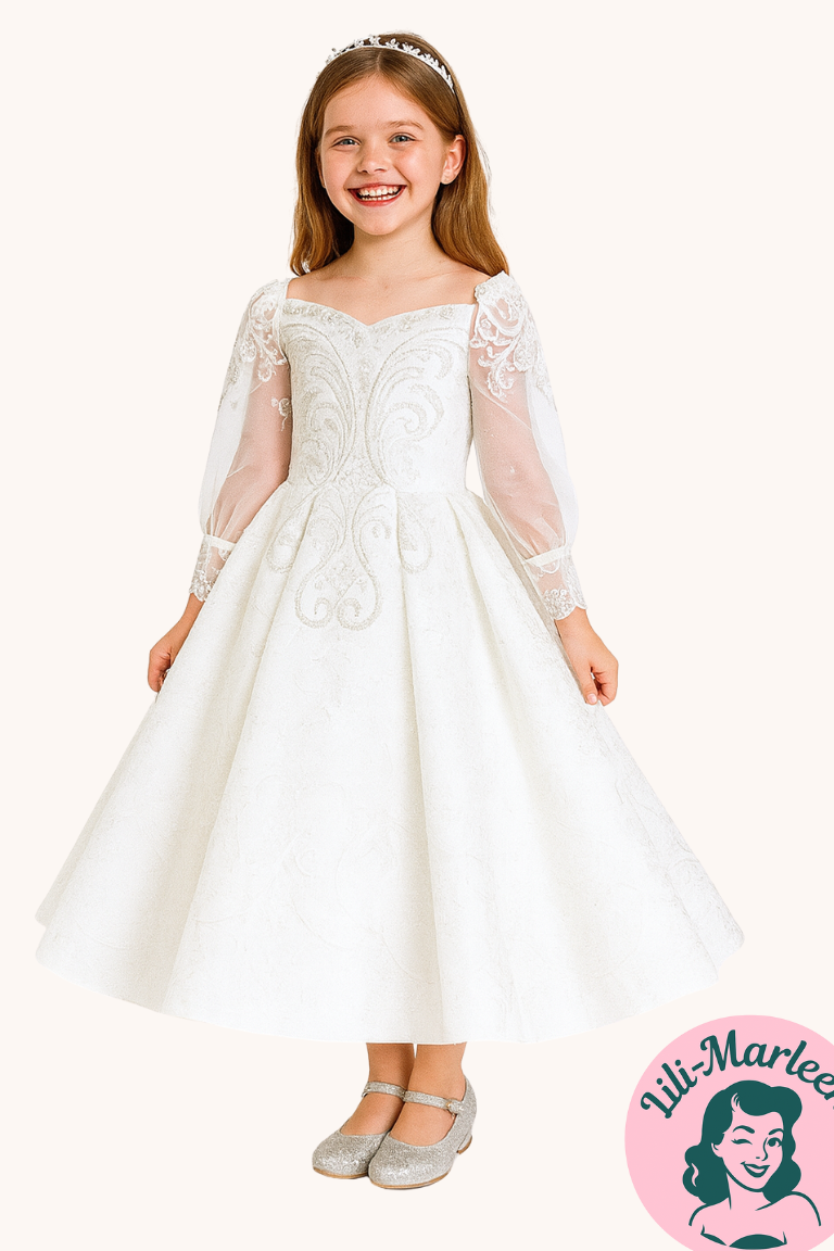 Deluxe Børnegallakjole – Little Sarah – Hvid prinsessekjole med pallietter, perler og puf - Little Sarah er en børnegallakjole ud over det sædvanlige – en hvid prinsessedrøm med de smukkeste pallietter, fine perler og det vildeste puf. Kjolen ligner noget taget direkte ud af et eventyr og vækker minder om ikoniske filmøjeblikke.
