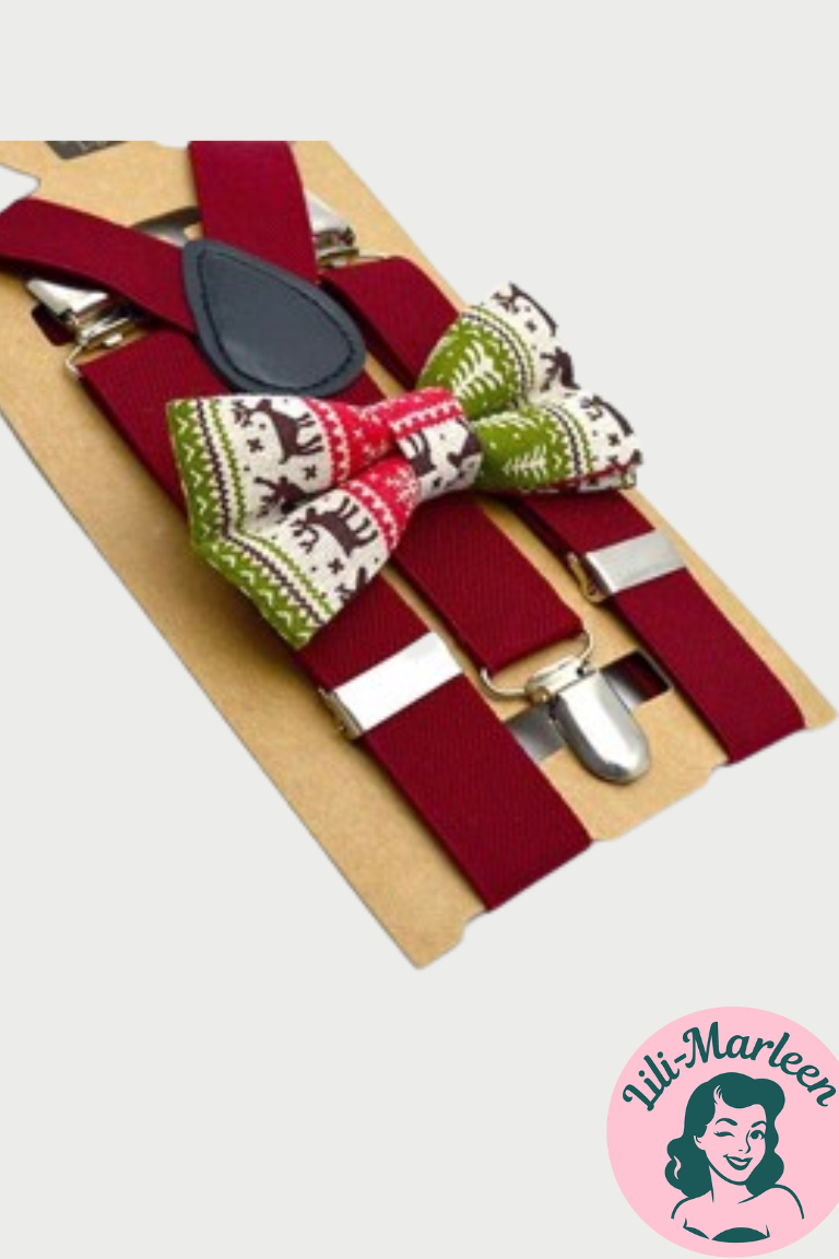 Et festligt julesæt til børn bestående af en mønstret butterfly i juletema og matchende seler i vinrød. Butterflyen har et hyggeligt design med rensdyr og grøn-røde detaljer, der giver masser af julestemning, mens selerne i dyb vinrød fuldender looket med klassisk elegance. Selerne er justerbare med stærke clips, og butterflyen har en fleksibel rem, hvilket gør sættet praktisk og komfortabelt til selv de længste julefester.