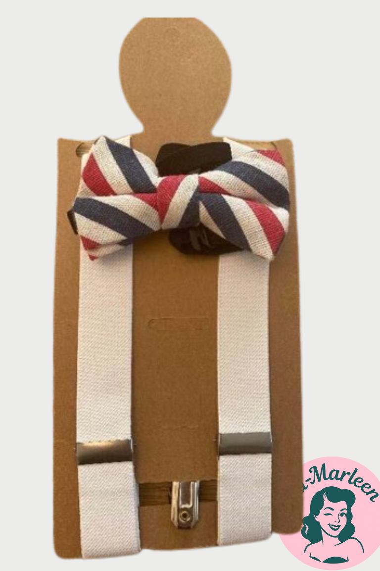 Et cool og iøjnefaldende sæt til børn bestående af en butterfly i rød, hvid og blå striber samt matchende hvide seler. Butterflyens design giver associationer til det britiske flag (Union Jack), hvilket skaber et moderne og festligt look. Selerne er klassiske hvide og justerbare med stærke clips, der sikrer komfort og holdbarhed. Perfekt til temafester, fødselsdage eller når dit barn skal skille sig ud med stil.