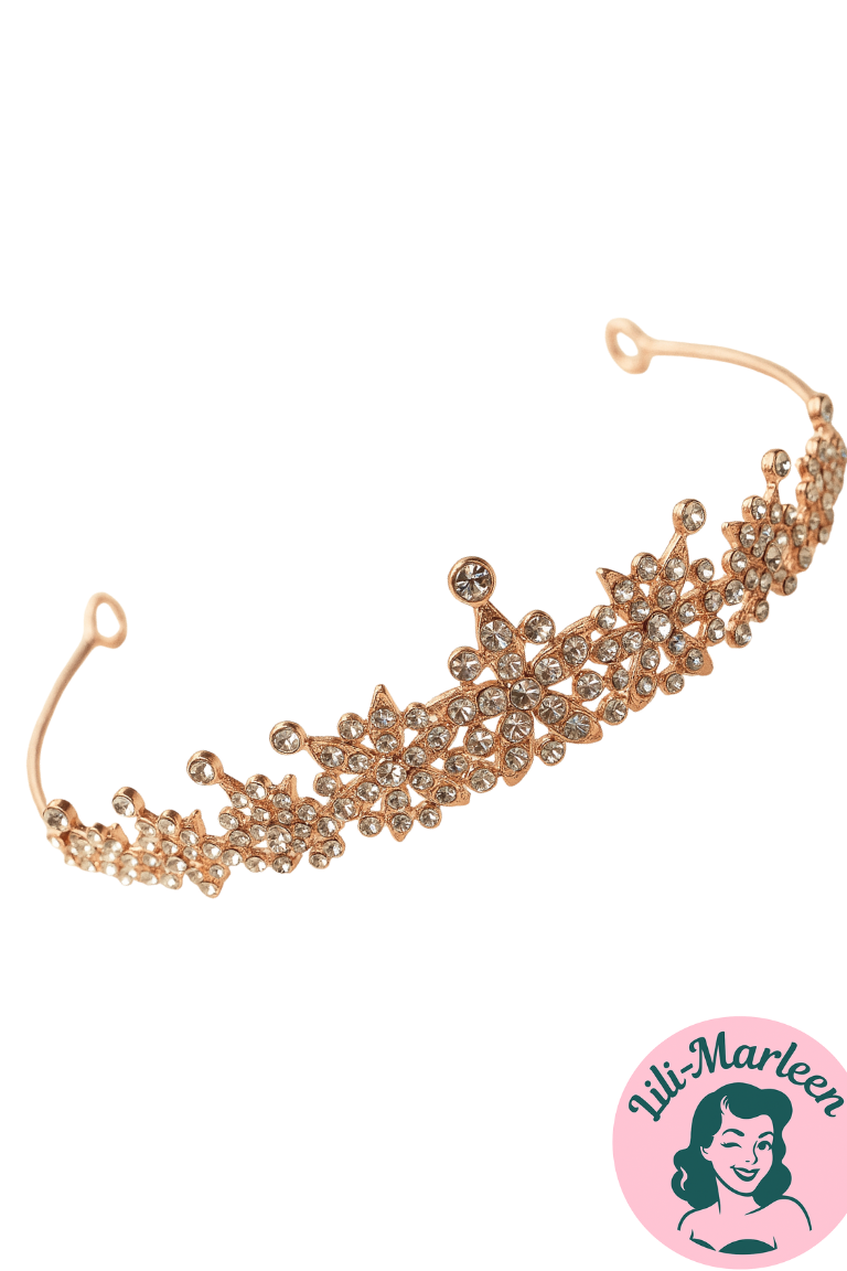 Giv dit look en kongelig finish med Lady Sommerbird, en elegant tiara i guldfarvet design prydet med glitrende krystaller. Den delikate blomsterinspiration og de fine detaljer gør den perfekt til både brude, galla og særlige festlige lejligheder.