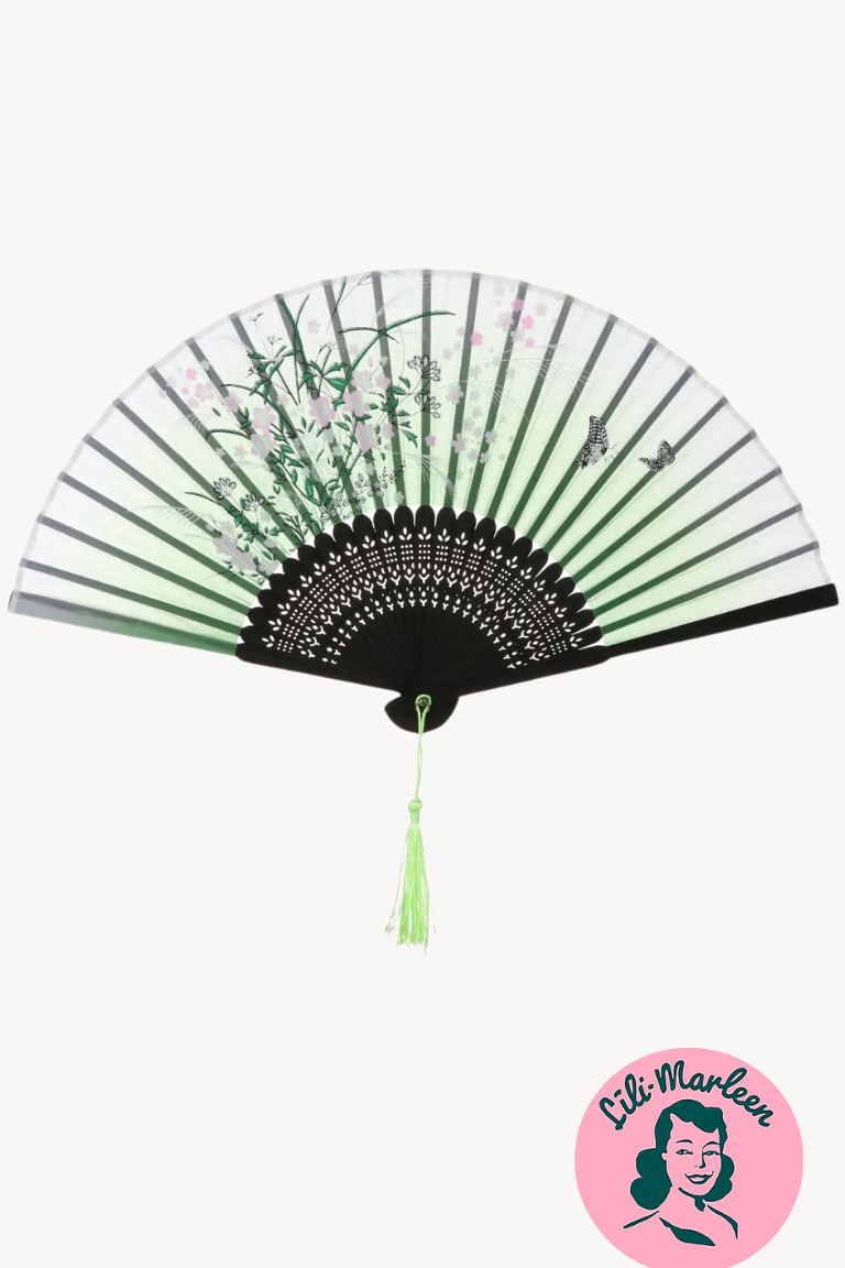 En raffineret håndvifte i grønne og sorte toner, dekoreret med delikate blomster, grene og små sommerfugle, som danser hen over stoffet. Den smukke udskæring i viftespilerne og den grønne kvast giver et strejf af orientalsk poesi. Perfekt til varme sommerdage – eller som et romantisk accessorie, der fuldender dit vintage-look.