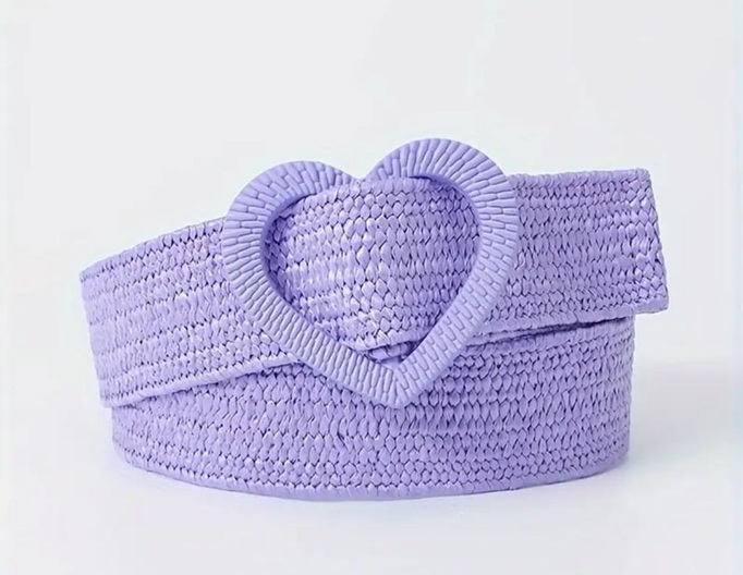 Giv din stil et strejf af romantik og eventyr med dette lilla stråbælte i flettet look. Det hjerteformede spænde matcher i tone og gør bæltet perfekt til både vintagekjoler, feminine bluser og lette sommeroutfits. Den smukke lavendelfarve emmer af forår, frihed og lidt prinsessedrøm – uden at blive for sød.