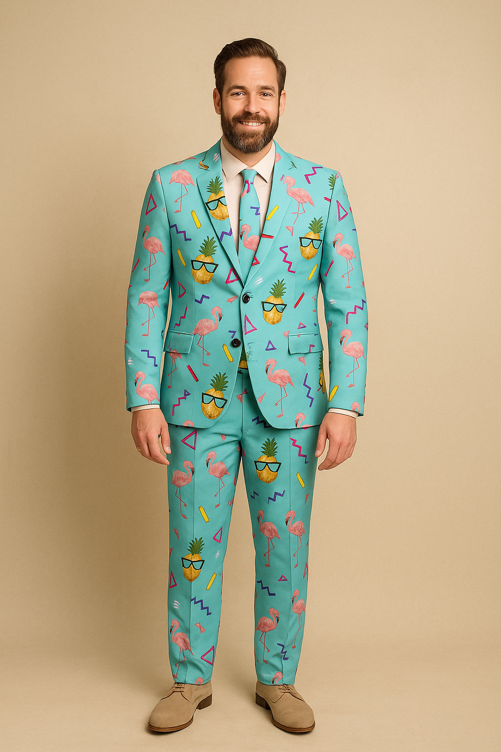 Gør klar til at vække opsigt, sprede smil og danse dig gennem tropenatten i Funky Flamingo Fiesta – et jakkesæt med attitude, farver og fest i hver eneste syning! Med pink flamingoer, solbrille-ananas og 80’er-former på himmelblå baggrund er du ikke bare klædt på – du er klædt ud som sommerens hovedattraktion.
