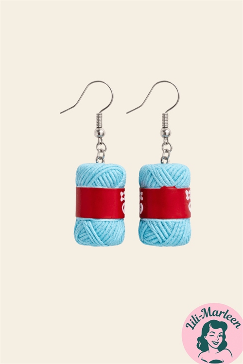 Teal Knit – garnnøgle-øreringe i tealblå med rød etiket