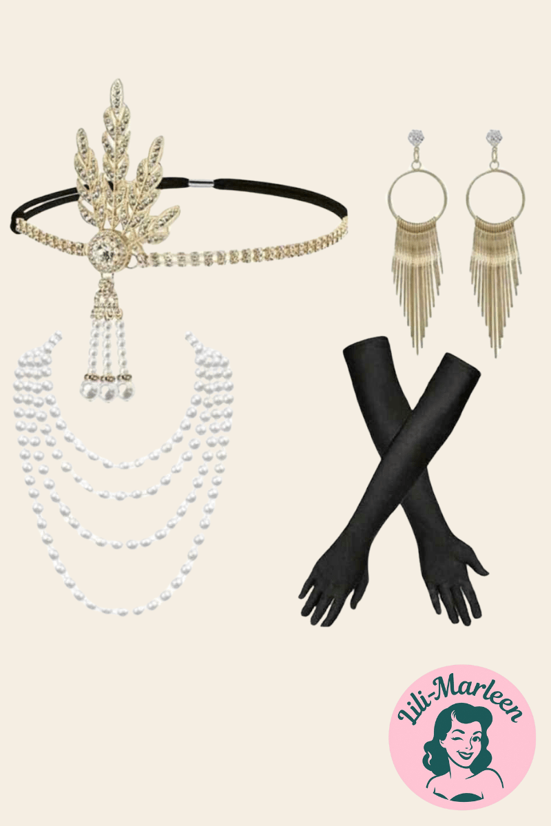 Sættet balancerer lys elegance og dramatik. Det elastiske hårbånd i guldlook med funklende sten og bladformet dekoration skaber fokus og højde. Den lange perlehalskæde giver klassisk flapper-raffinement, mens øreringene med ring og frynser tilfører bevægelse og sceneeffekt. De sorte lange handsker lukker looket med kontrast og teater.