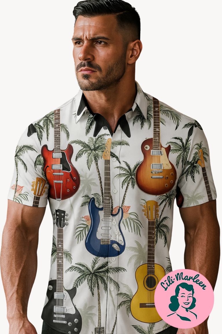 #GuitarGrooves #HerreskjorteGuitar #RockSkjorteSommer #VintageStyleMen #LiliMarleenStyle #StatementShirt #MusicVibes