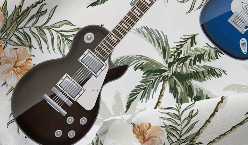 Guitar Grooves – Kortærmet Herreskjorte med Guitarprint & Tropisk Rock’n’Roll