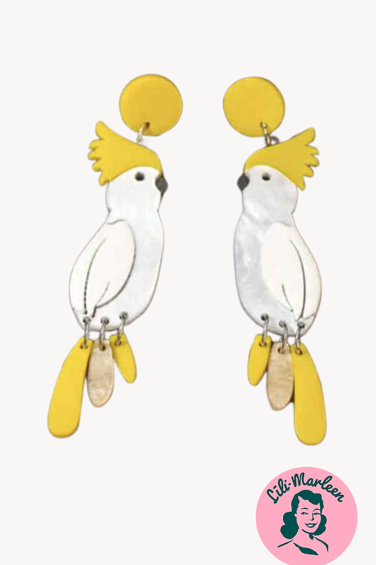 Et par charmerende statement-øreringe, hvor livlige kakaduer i hvid og gul folder sig ud i et legende og elegant design. De lette detaljer og den glade farvepalet giver et friskt pust af sommer, humor og vintagepoesi – perfekte til dig, der elsker smykker med personlighed og kant.