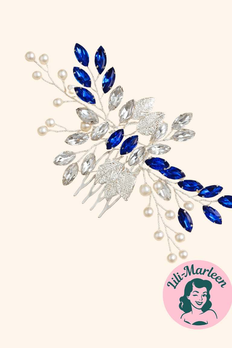 Hårkam: Smuk hårkam blå/sølv med sten, perler og blomster