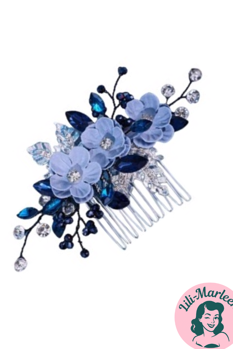 Skab et romantisk og sofistikeret look med denne fortryllende hårkam, dekoreret med blå stofblomster, funklende krystaller og delikate sølvgrene. Perfekt til brude, brudepiger, gallafester og andre særlige begivenheder, hvor elegance er i fokus.