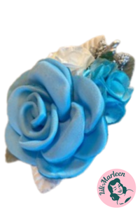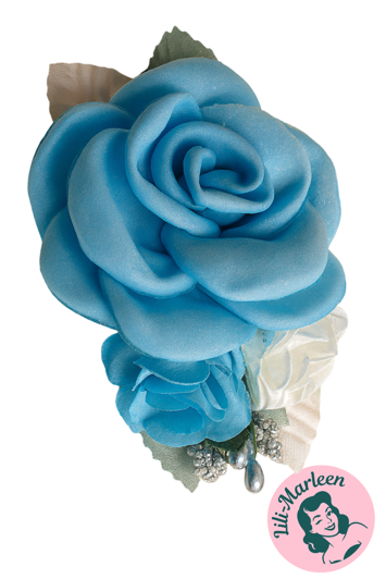 Detaljer: Hårklips med roser og blomster Farver: Blå, hvid og sølv Størrelse: ca. 8 x 5 cm Nem at sætte i håret – ideel til både løst hår og opsætninger
