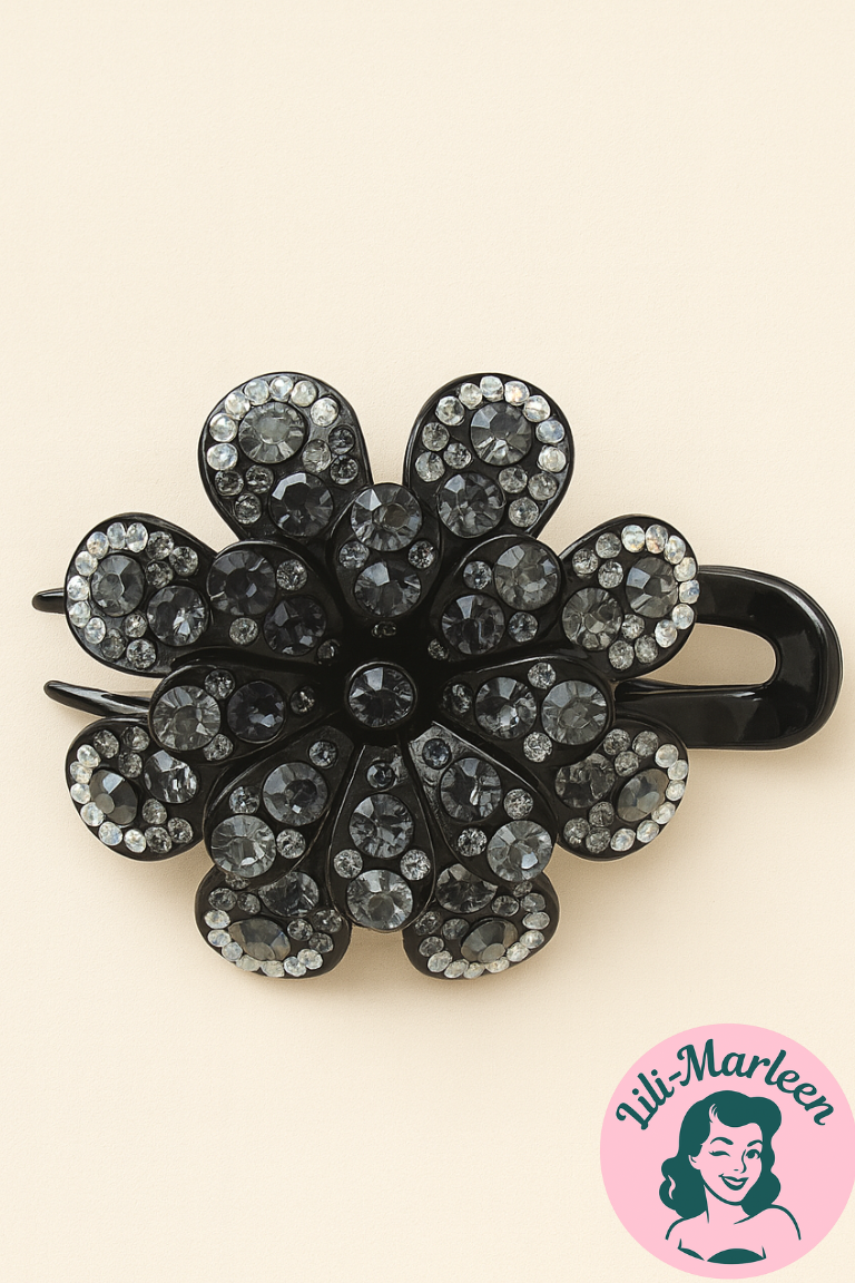 Hårklips - Stor Blomst med Glitrende Sten, navy/sort/hvid