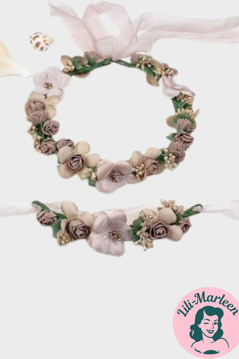 En elegant hårkrans med matchende corsage i smukke caffelatte- og beige nuancer. De naturtro roser og blomster giver et stilfuldt og romantisk udtryk, mens satinbåndet gør kransen let at justere. Perfekt til bryllup, konfirmation, dåb eller fest, hvor et klassisk og sofistikeret look ønskes.