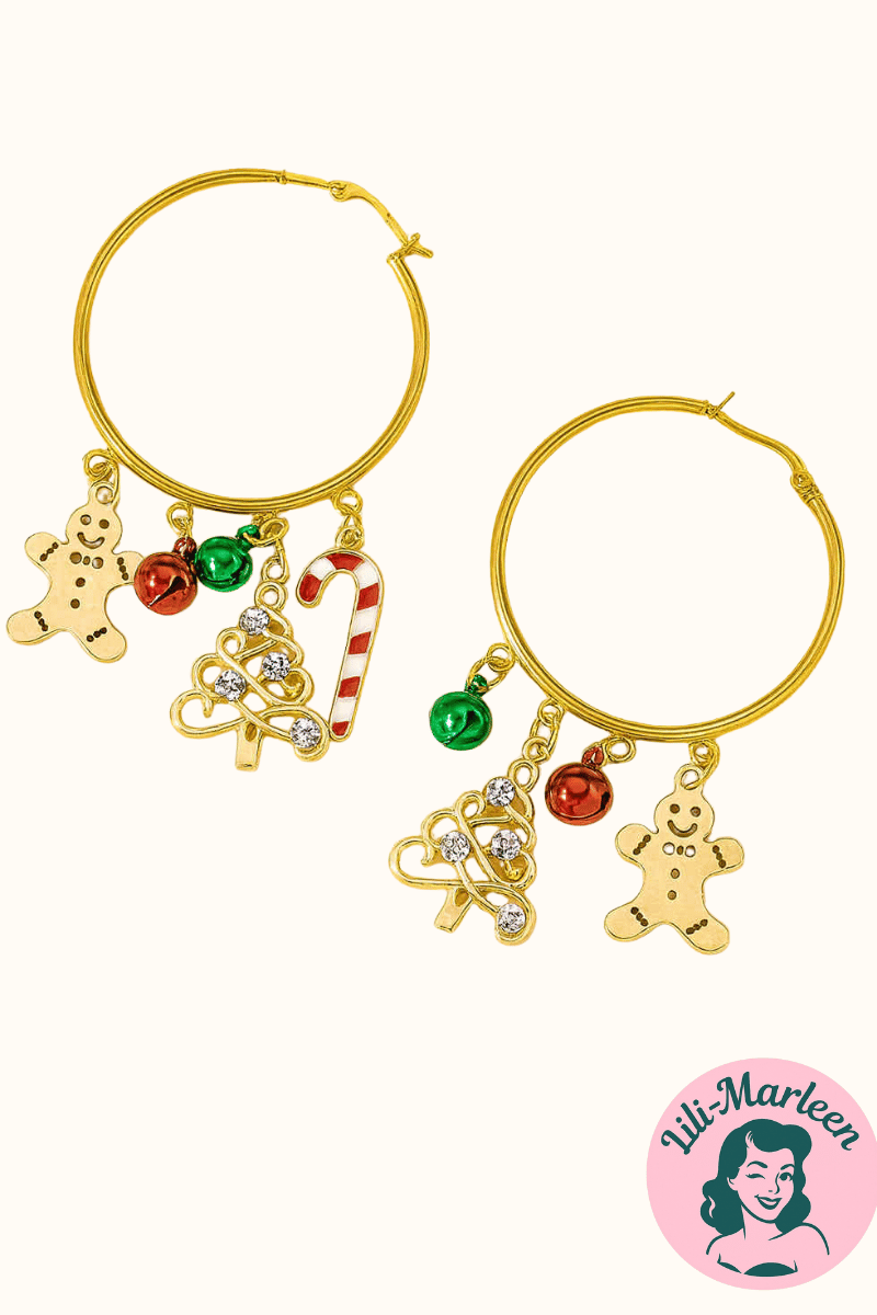 De her hoops er for dig, der ikke gider gemme julen væk. De små guldcharms – pebermyntepind, juletræ, julekugler og en glad honningkage-mand – giver et legende, farverigt og uimodståeligt udtryk. Det er umuligt ikke at smile, når de dingler med, og de er perfekte, når du vil gå all-in på julehumør uden at miste stilen.