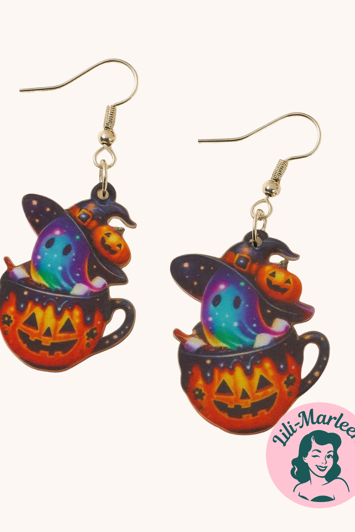 Hængeøreringe - Græskar spøgelse i kop Tilføj et nuttet og skørt touch til din stil med disse hængeøreringe i akryl – perfekt til halloween og lidt hverdagsmagi!