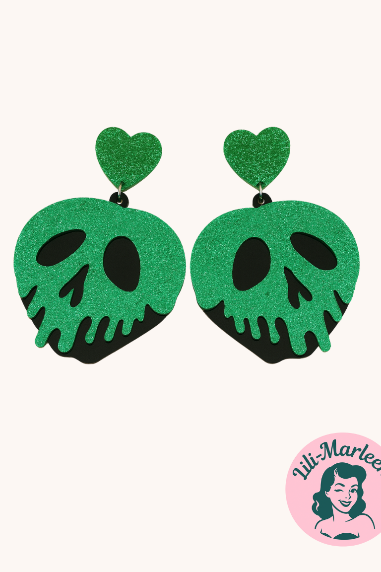 Disse unikke grønne glimmerøreringe er skabt til dig, der elsker at kombinere glitter med attitude. Det søde hjerte som ørestik og det dramatiske skull-vedhæng giver et cool og iøjnefaldende udtryk – perfekt til koncerter, festival eller når hverdagen skal have et strejf af kant.