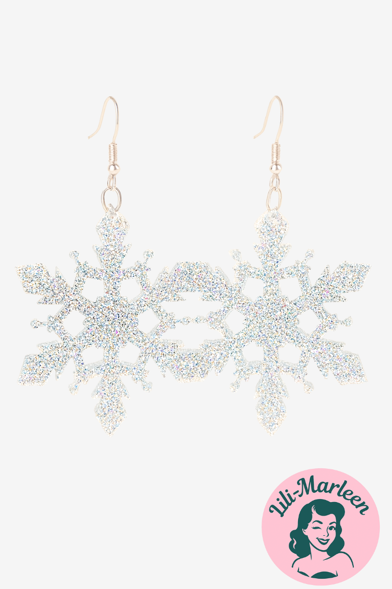 Lad dit look funkle med disse store hængeøreringe formet som snefnug i sølvglimmer. De glitrer smukt i lyset og tilføjer en festlig og iøjnefaldende detalje til ethvert december-outfit. Perfekte til julefrokosten, juleaften eller som en sjov gave til hende, der elsker accessories med ekstra glans.
