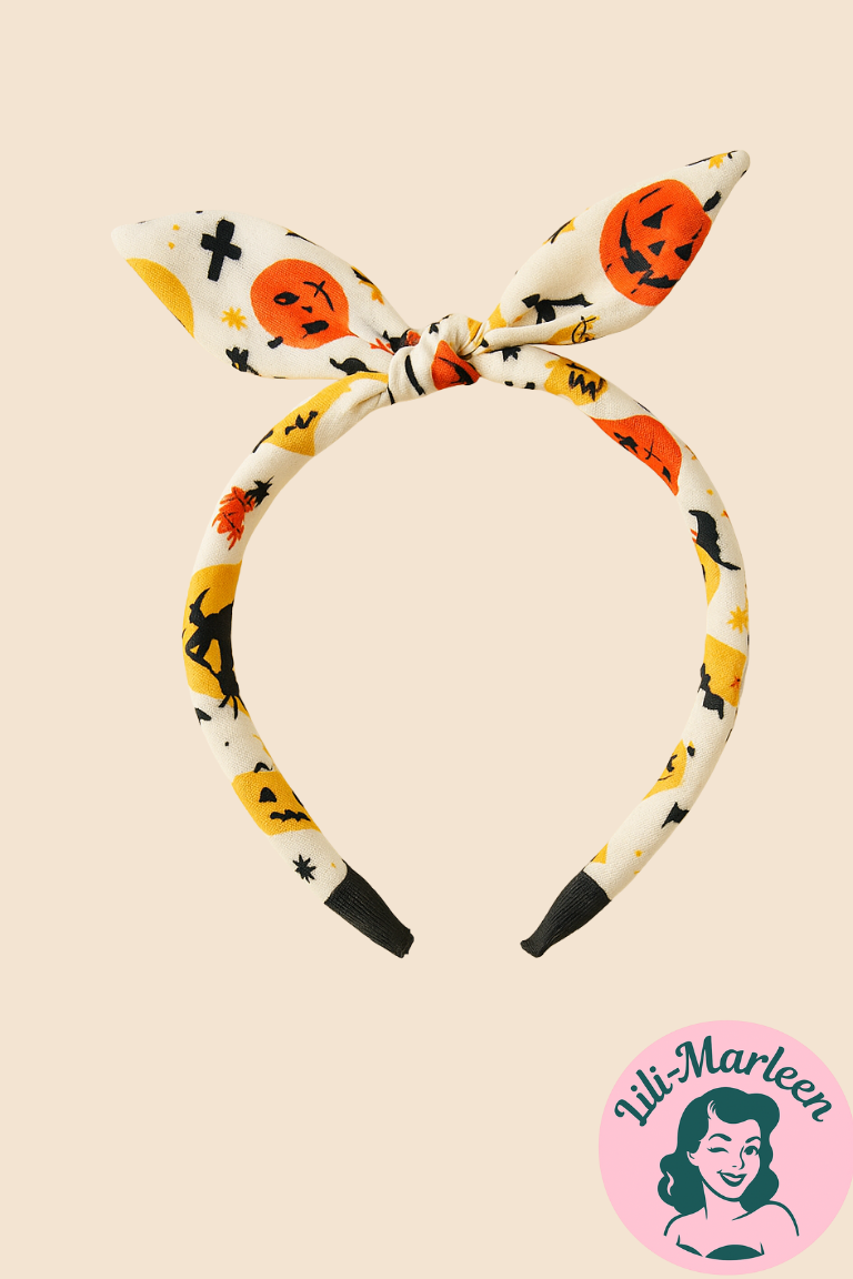 Cremefarvet hårbøjle med Halloween-print (græskar, hekse, flagermus og små motiver)