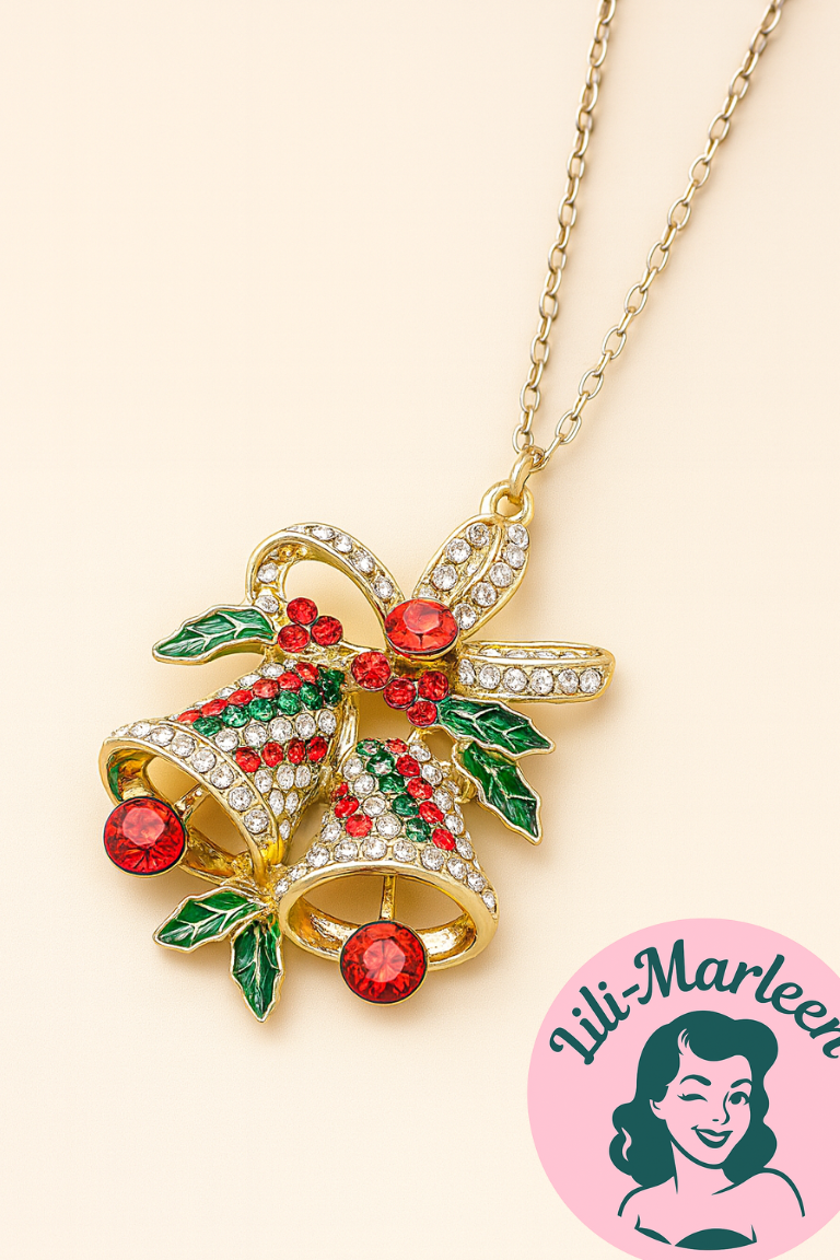 Halskæde – Juleklokker med røde sten og grønne blade - En funklende halskæde til julens festligheder