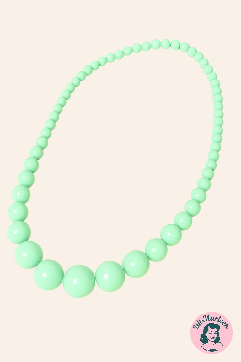 Hvis Miss Diva kun måtte vælge ét smykke – så blev det denne. Den mintfarvede halskæde med plastperler i forskellige størrelser emmer af charme, mod og vintage-glæde. Den giver dit outfit det helt rigtige pop af farve og attitude – uanset om du matcher den med en swingkjole, T-shirt eller rød læbestift og et blink.