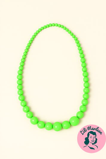 Hvis Miss Diva kun måtte vælge ét smykke – så blev det denne. Den græsgrønne farvede halskæde med plastperler i forskellige størrelser emmer af charme, mod og vintage-glæde. Den giver dit outfit det helt rigtige pop af farve og attitude – uanset om du matcher den med en swingkjole, T-shirt eller rød læbestift og et blink.