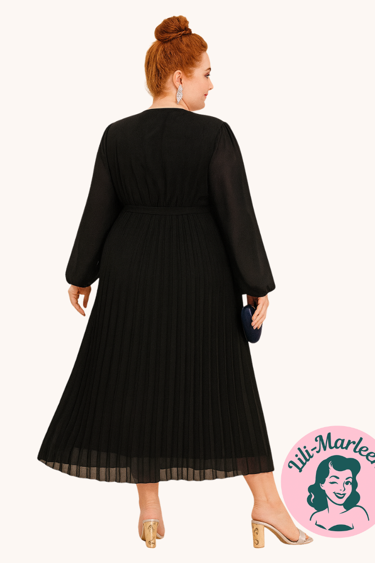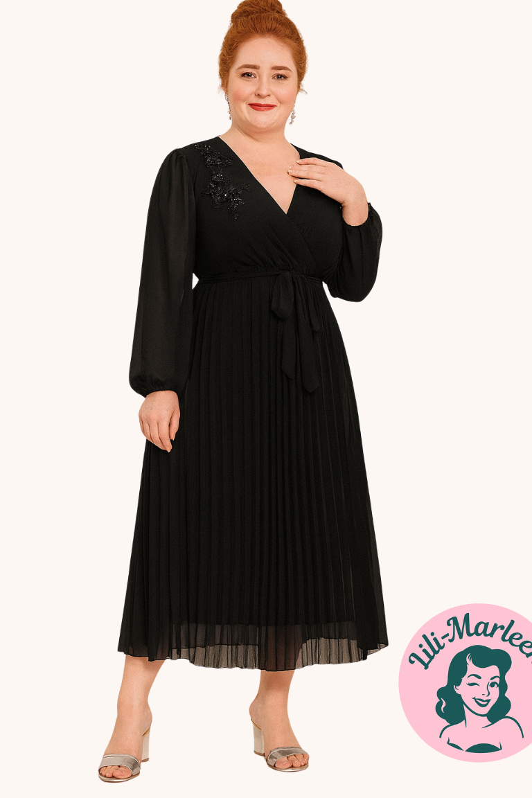 Halvlang gallakjole - Calyn, sort - Skøn halvlang gallakjole/festkjole med et lille ærme - Vidunderlige halvlang galla/festkjole i sort med pliset og smukt dekoreret blomster - med v-hals skåret i med slå-omsnit til at fremhæve din talje. Kjolen er indbegrebet af elegance og festlighed.