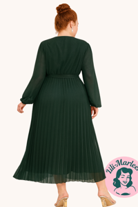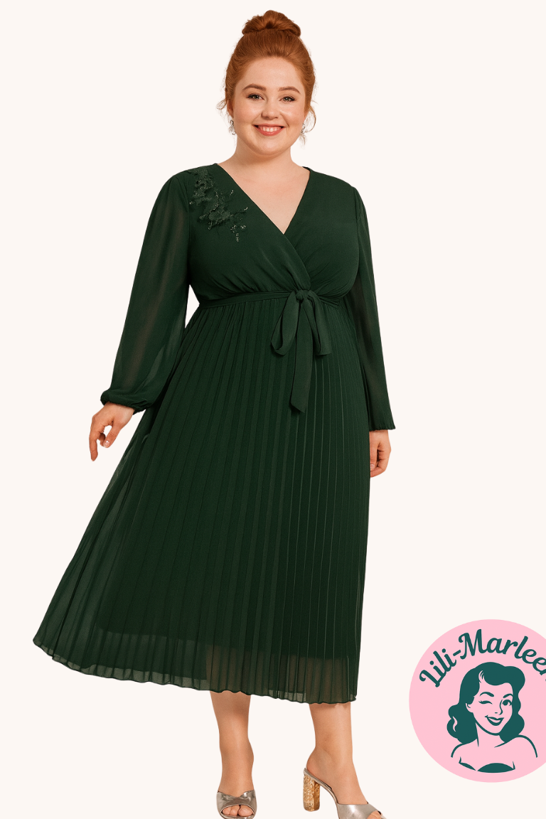 Vidunderlige halvlang galla/festkjole i grøn med pliset og smukt dekoreret blomster - med v-hals skåret i med slå-omsnit til at fremhæve din talje. Kjolen er indbegrebet af elegance og festlighed.
