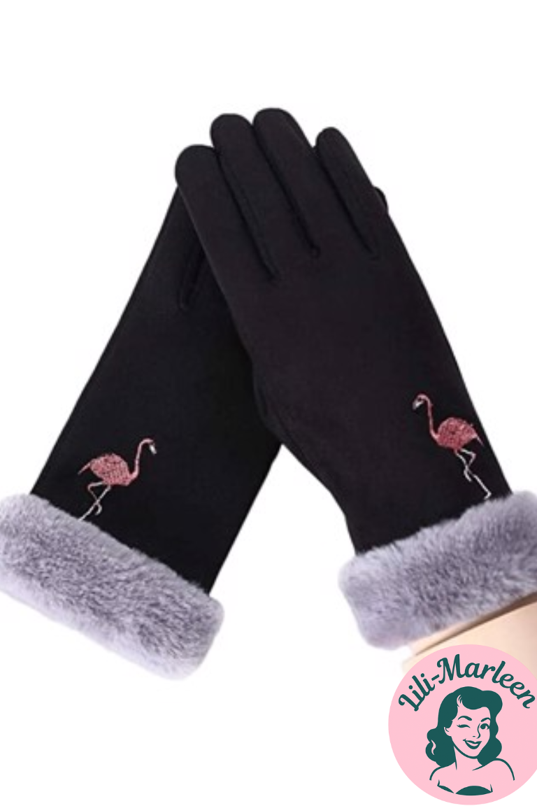 Hold varmen med stil! De smukke Juliane handsker i sort er både lune og elegante. Dekoreret med et sjovt flamingo-design, er de det perfekte tilbehør til kvinder, der elsker en unik og feminin detalje i vinterens kulde.