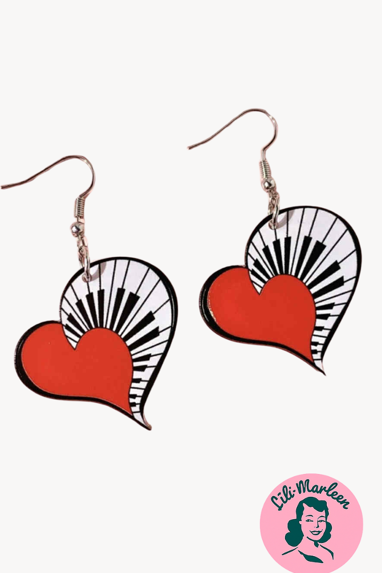 Et par skønne øreringe, hvor røde hjerter fanger blikket, mens sort-hvide klavertangenter danner en strålende vifte bag dem. Designet oser af humor, vintage-vibes og kunstnerisk flair – perfekt til dig, der elsker at vise din passion for musik eller bare vil bære lidt ekstra attitude.