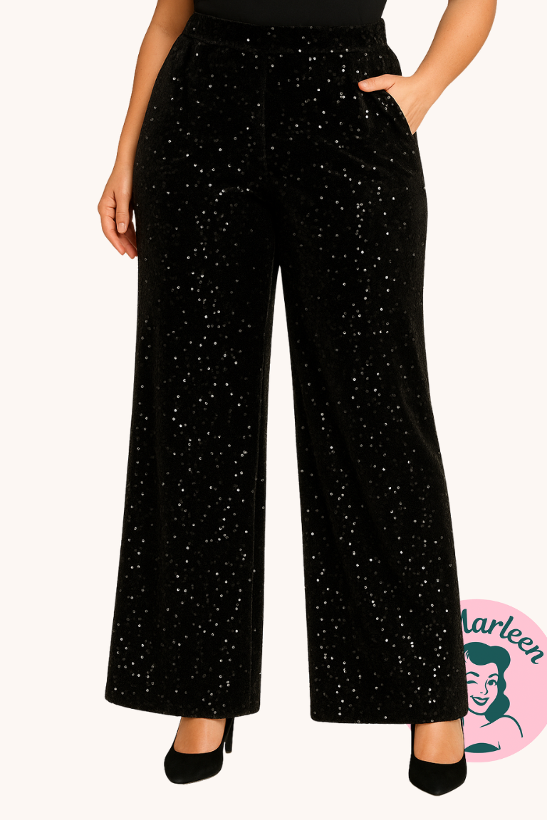 Højtaljet Sorte Velourbukser med Palietter - Miss Midnight Glam