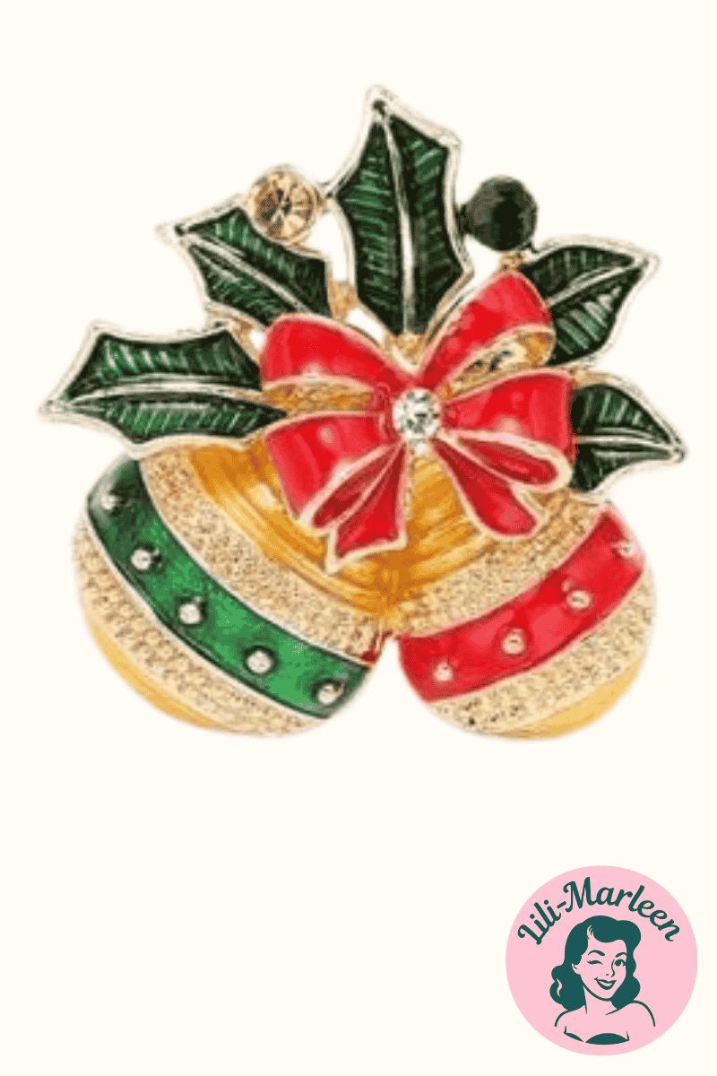 Lad julen klinge smukt med Holly Bells – en klassisk og elegant broche, der kombinerer røde og grønne nuancer med gyldne detaljer. De to klokker er pyntet med et rødt bånd, grønne kristtornblade og en funklende sten i midten, der giver et tidløst og festligt udtryk. Perfekt som pynt på kjoler, jakker eller halstørklæder – og et must-have for enhver, der elsker vintagejul med glimmer.