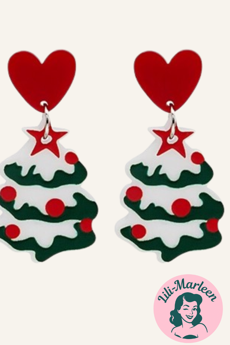 Hængeøreringe – Juletræ med Hjerte - Festlige juleøreringe med juletræ og rødt hjerte - Tilføj ekstra hygge til dit december-look med disse festlige hængeøreringe. Designet med rødt hjerte som top og et pyntet juletræ i grøn, rød og hvid, er de perfekte til julefrokost, juleaften eller når du vil sprede lidt ekstra glæde i juletiden.