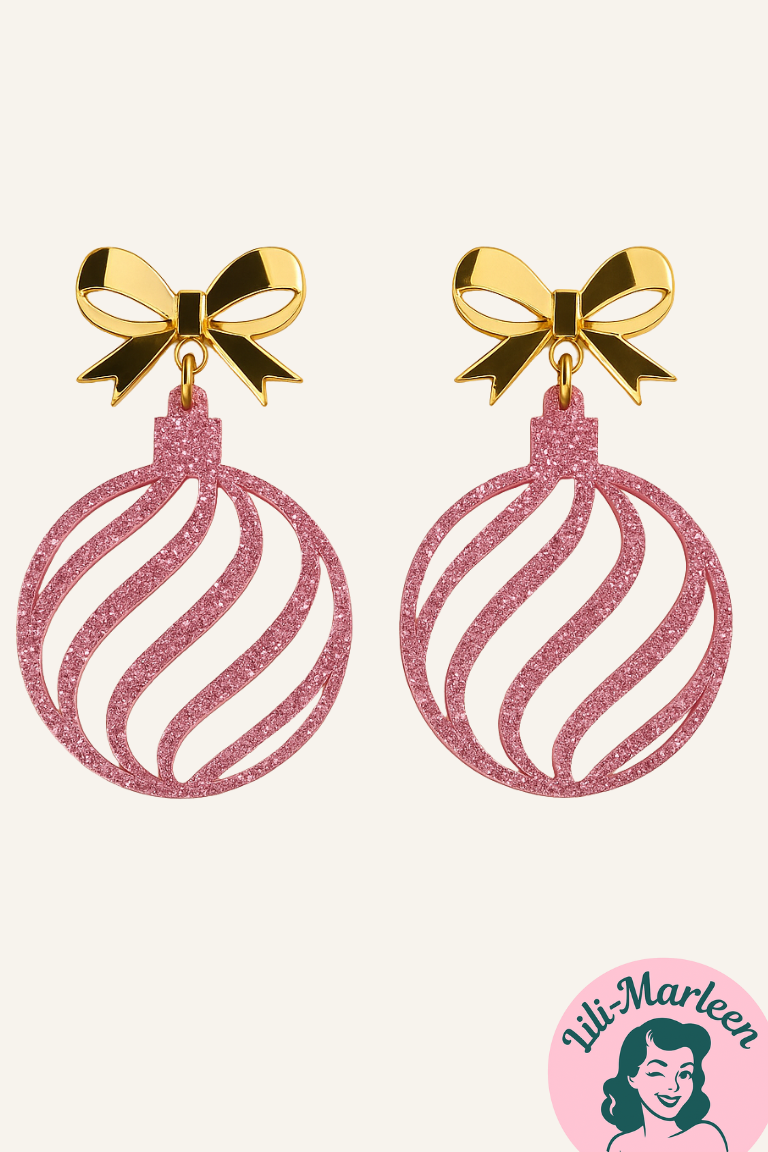 Hængeøreringe – Lyserøde Julekugler - Festlige juleøreringe med sløjfe og glimmer: Tilføj et feminint og festligt touch til dit december-look med disse hængeøreringe designet som store lyserøde julekugler i glimmer. Øverst er de pyntet med en elegant sløjfe i guld og sort med en lille sten i midten, hvilket giver et ekstra strejf af glamour. Perfekte til julefrokost, juleaften eller som gave til hende, der elsker accessories med både farve og glans.